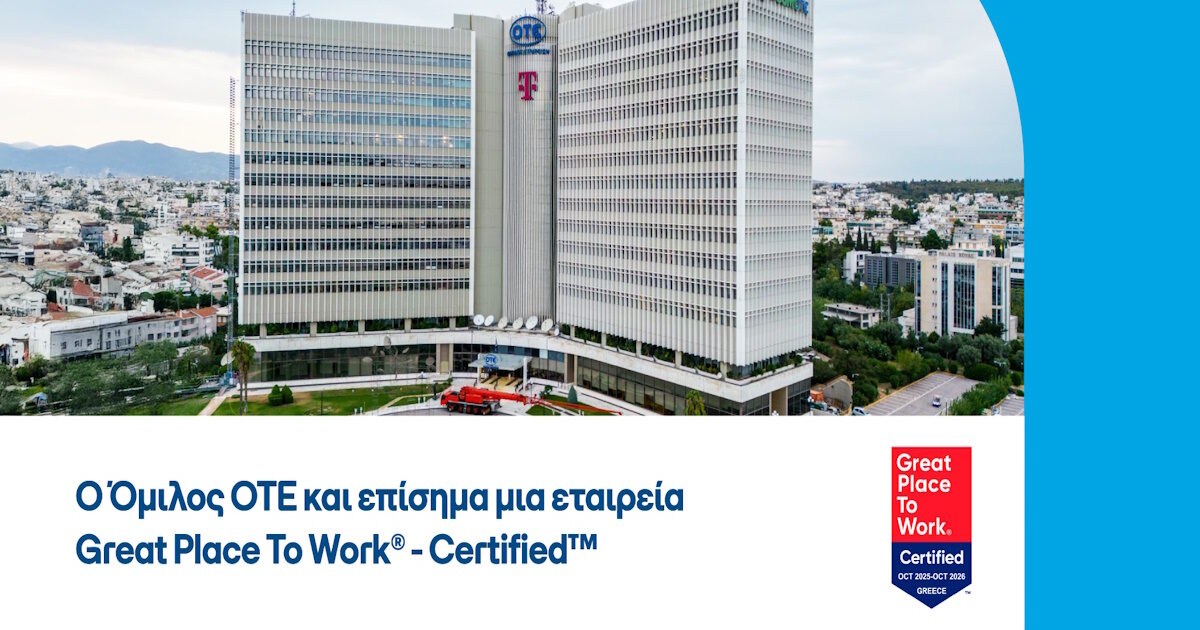 Ο Όμιλος ΟΤΕ έλαβε την πιστοποίηση Great Place To Work, μια σημαντική τιμητική διάκριση που αναγνωρίζει την κουλτούρα του εργασιακού περιβάλλοντος. Η πιστοποίηση είναι αποτέλεσμα της  ανεξάρτητης και ανώνυμης έρευνας του Great Place To Work Hellas, παγκόσμιου ηγέτη στην κουλτούρα του χώρου εργασίας, στην οποία συμμετείχαν οι εργαζόμενοι του Ομίλου. Η συγκεκριμένη τιμητική διάκριση επιβεβαιώνει τη σταθερή δέσμευση του Ομίλου στη δημιουργία ενός σύγχρονου, συμπεριληπτικού και υψηλών προδιαγραφών περιβάλλοντος εργασίας, που προάγει την ανάπτυξη και την ευημερία των ανθρώπων του.
