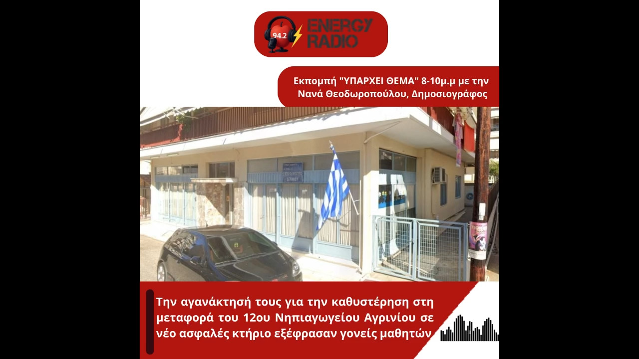 Την αγανάκτησή τους για την καθυστέρηση στη μεταφορά του 12ου Νηπιαγωγείου Αγρινίου σε νέο ασφαλές κτήριο εξέφρασαν γονείς μαθητών στην εκπομπή «ΥΠΑΡΧΕΙ ΘΕΜΑ» με την δημοσιογράφο Νανά Θεοδωροπούλου στον Energy 94.2.