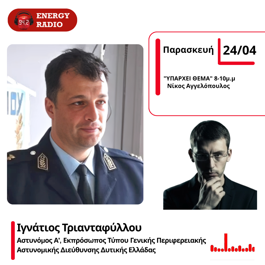 Νέες συμβουλές προς τους πολίτες για την προστασία τους από τους απατεώνες, έδωσε μιλώντας στον energy 94,2 και τον Νίκο Αγγελόπουλο, ο Αστυνόμος Α’, εκπρόσωπος Τύπου της Γενικής Περιφερειακής Αστυνομικής Διεύθυνσης Δυτικής Ελλάδας, Ιγνάτιος Τριανταφύλλου.