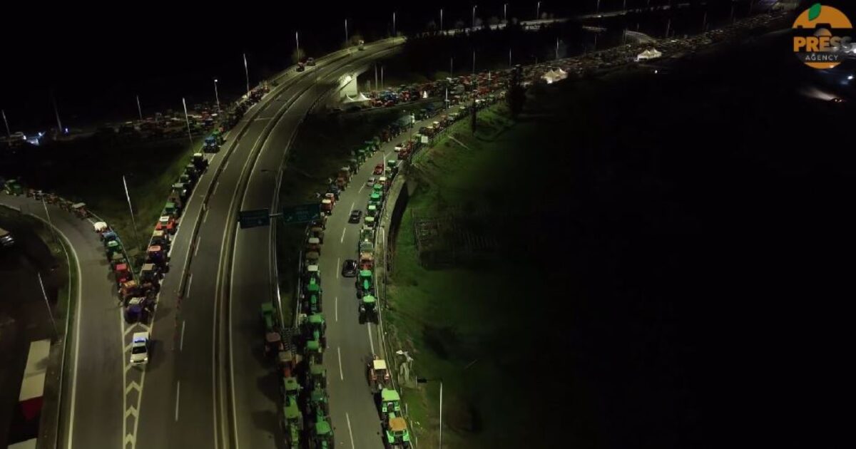 Οι εικόνες από drone του πρακτορείου Orange στο μπλόκο της Νίκαιας τη νύχτα της Πρωτοχρονιάς με τα εκατοντάδες τρακτέρ πάνω στον δρόμο, είναι εντυπωσιακές. Μια ατέλειωτη σειρά από φώτα και σιδερένιους όγκους μέσα στο σκοτάδι, σκηνές με αναμμένα φώτα και βαρέλια με φωτιά για το τσουχτερό κρύο.