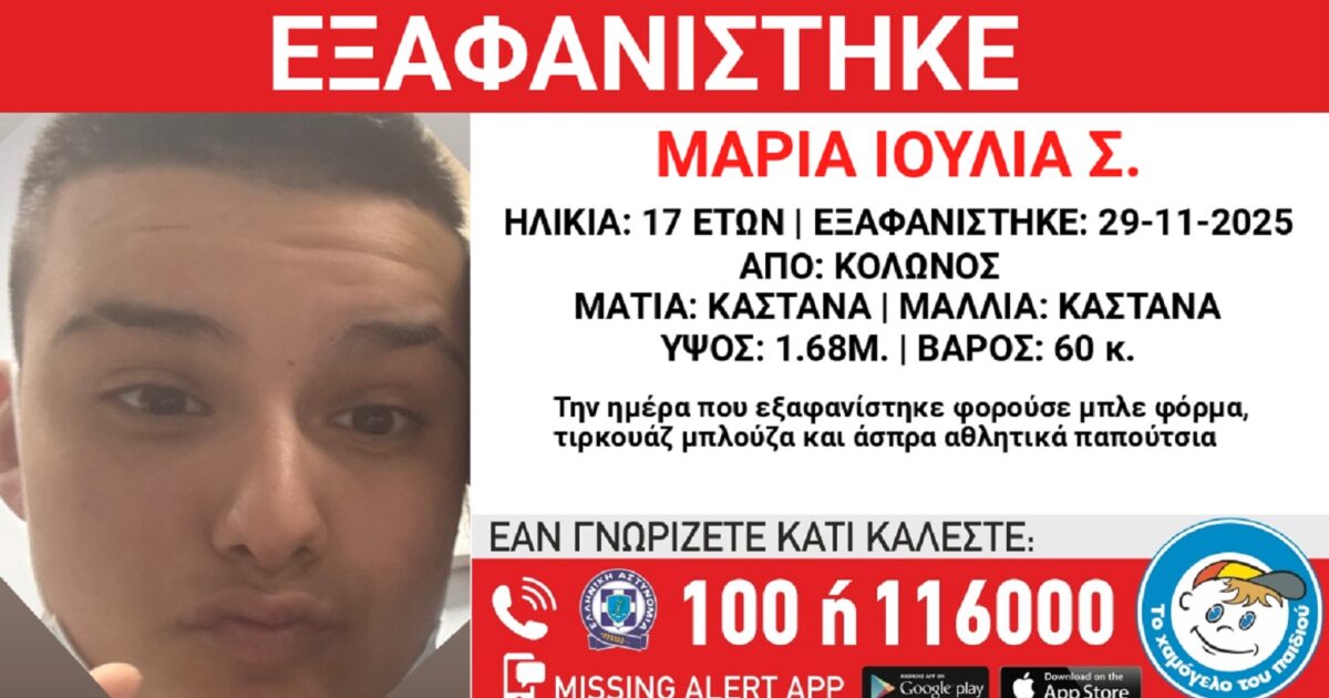 Συναγερμός έχει σημάνει στον Κολωνό από την εξαφάνιση της 17χρονης Μαρίας Ιουλίας, με το «Χαμόγελο του Παιδιού» να εκδίδει σχετική ανακοίνωση.
