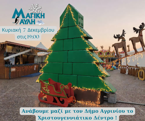 Την Κυριακή 7 Δεκεμβρίου, στις 19:00, ανάβουμε μαζί με τον Δήμο Αγρινίου το Χριστουγεννιάτικο Δέντρο στην κεντρική πλατεία – και έπειτα συνεχίζουμε το ταξίδι μας στον χώρο της Μαγικής Αυλής, στο δημοτικό πάρκινγκ (Καλλέργη 9).
