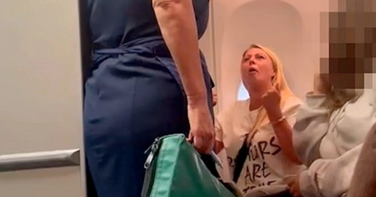 Βίντεο που κατέγραψαν επιβάτες δείχνουν τη γυναίκα να χειρονομεί, να βρίζει και να φωνάζει, την ώρα που άλλοι προσπαθούν να την ηρεμήσουν, λέγοντάς της να «χαλαρώσει».