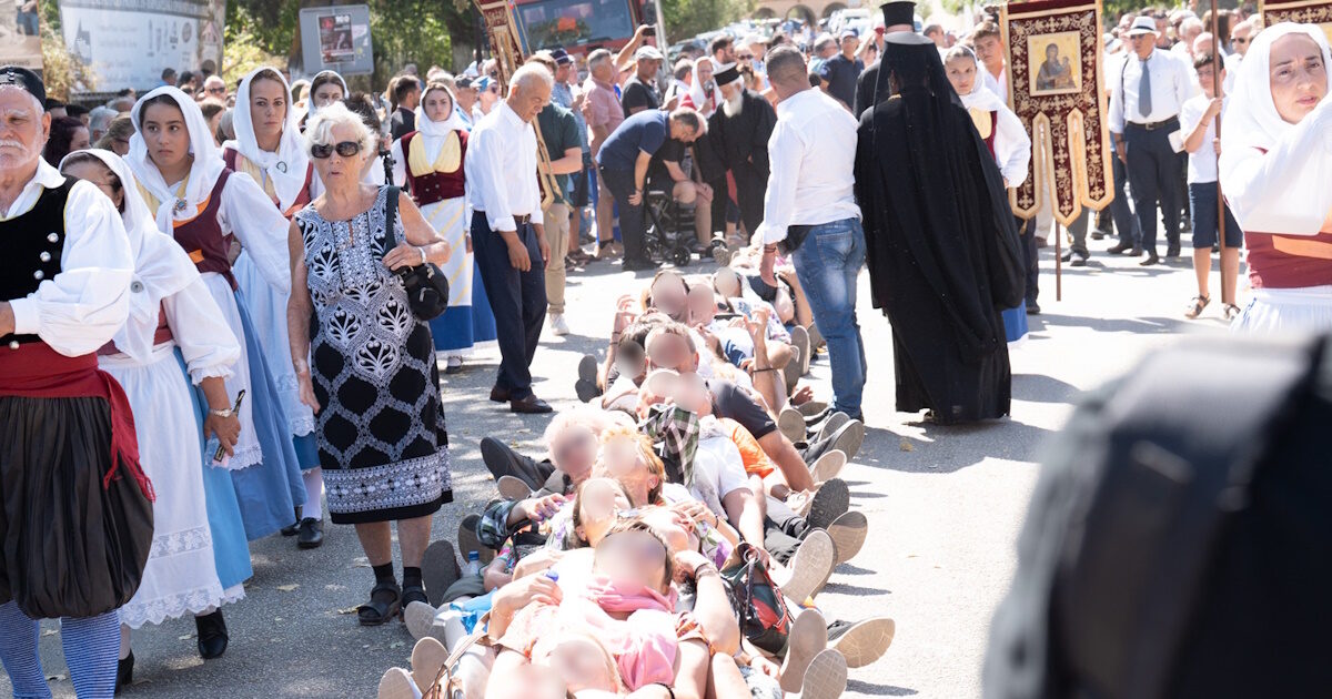 Τότε, δεκάδες πιστοί ξάπλωσαν στο έδαφος, για να περάσει από πάνω τους του σκήνωμα του Αγίου, όπως βλέπετε στις εικόνες του kefalonitis.com.