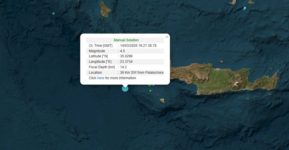 Πιο συγκεκριμένα, η δόνηση σημειώθηκε 87,3 χλμ νοτιοδυτικά των Χανίων (36 νοτιοανατολικά της Παλαιόχωρας) και το εστιακό βάθος είναι 14,2 χιλιόμετρα.
