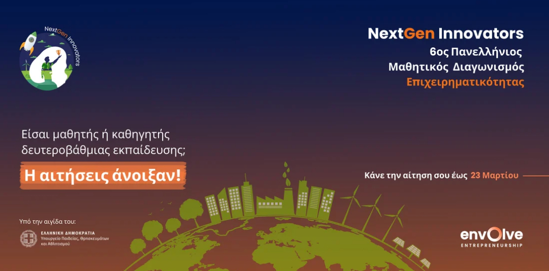 Την έναρξη του 6ου Πανελλήνιου Μαθητικού Διαγωνισμού Επιχειρηματικότητας NextGen Innovators προσκαλώντας μαθητές και μαθήτριες γυμνασίων, Γενικών Λυκείων και ΕΠΑΛ από όλη την Ελλάδα, αλλά και την ομογένεια, να αναπτύξουν και να παρουσιάσουν τις δικές τους καινοτόμες, βιώσιμες επιχειρηματικές ιδέες, ανακοίνωσε το Envolve Entrepreneurship. Το NextGen Innovators τελεί υπό την αιγίδα του υπουργείου Παιδείας, Θρησκευμάτων και Αθλητισμού και αποτελεί ένα μοναδικό πρόγραμμα βιωματικής μάθησης, όπου μαθητικές ομάδες εργάζονται για να αναπτύξουν επιχειρηματικές ιδέες με ουσιαστικό περιβαλλοντικό και κοινωνικό αποτύπωμα.