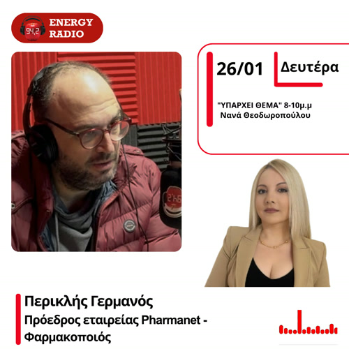 Στην εκπομπή της δημοσιογράφου Νανάς Θεοδωροπούλου στον Energy 94,2 φιλοξενήθηκε ο Περικλής Γερμανός, φαρμακοποιός και εκπρόσωπος της φαρμακαποθήκης Pharmanet, σε μια συζήτηση με πολλές και ουσιαστικές πτυχές, που κινήθηκε από την αγάπη για το ραδιόφωνο έως τις εξελίξεις στον χώρο της υγείας και του φαρμάκου.