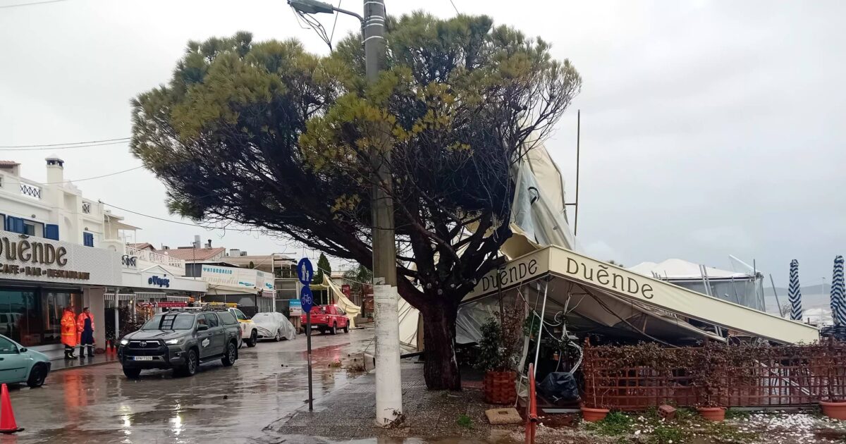 Από την ένταση των ανέμων έπεσαν σκέπαστρα και τέντες, ενώ αντικείμενα από τα καταστήματα σκορπίστηκαν στον δρόμο.