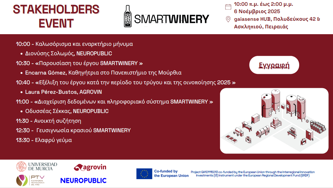 Η NEUROPUBLIC και η κοινοπραξία του έργου SMARTWINERY σας προσκαλούν στην Ημερίδα Ενημέρωσης⏰ 10:00 – 14:00