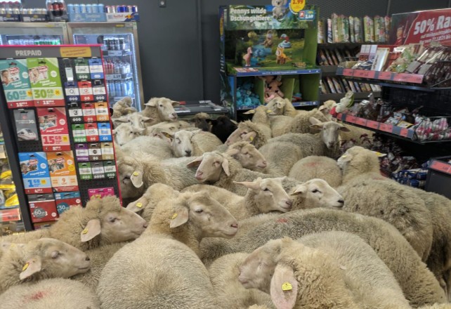 After breaking away from their 500-strong herd, the brazen sheep spent 20mins milling around in the Penny supermarket before ewe-turning and seeing themselves out. pic.twitter.com/ZkdXvT7Jcb