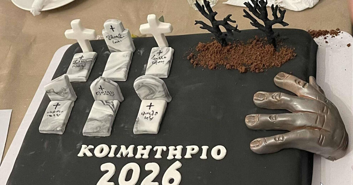 Συγκεκριμένα η βασιλόπιτα των Κοιμητηρίων Ρόδου για το 2026 που «έριξε» τα social media είναι μία μαύρη πίτα, που απεικονίζει νεκροταφείο και δείχνει τάφους, σαν να μην θέλει να μας πει «καλή χρονιά».