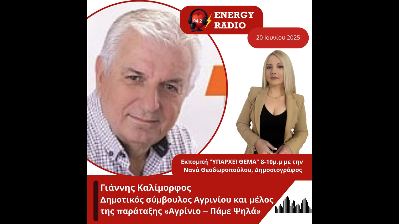 Συνέντευξη δημοτικού συμβούλου Αγρινίου και μέλους της παράταξης «Αγρίνιο–Πάμε Ψηλά» Καλλίμορφου Γιάννη στον Energy 94.2