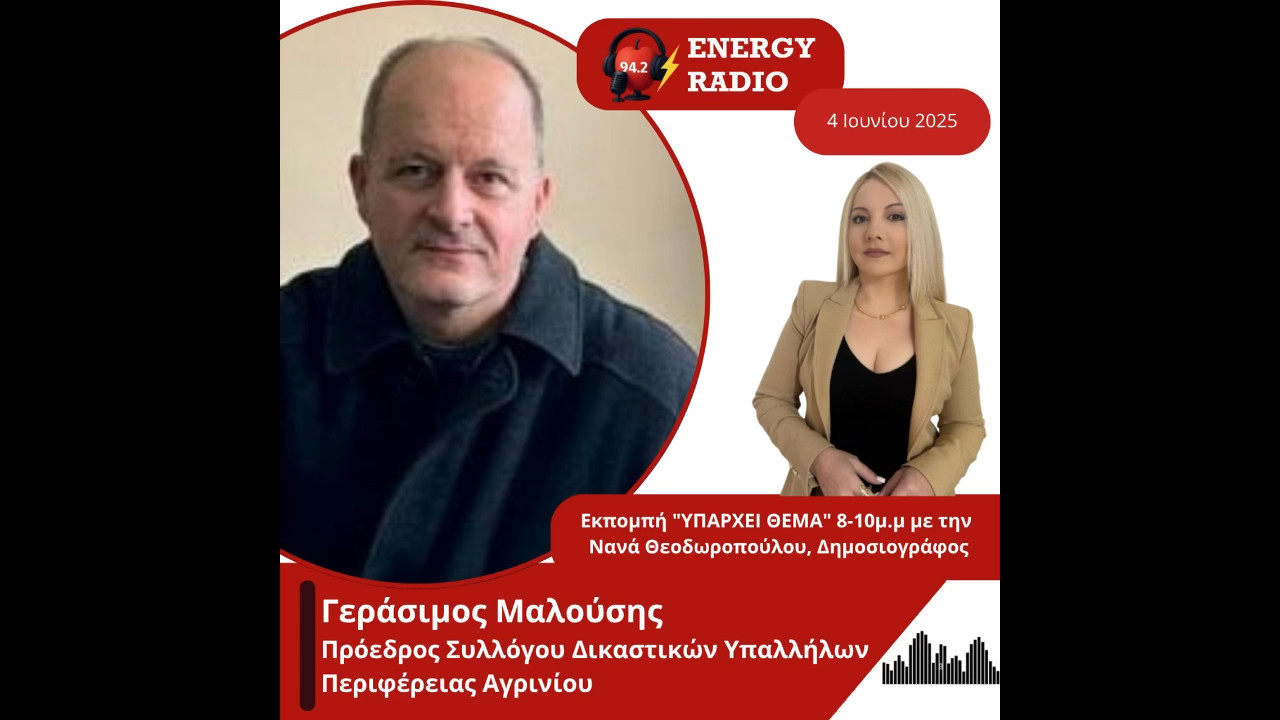 Ο Γεράσιμος Μαλούσης, Πρόεδρος του Συλλόγου Δικαστικών Υπαλλήλων Περιφέρειας Αγρινίου σε συνέντευξή του στην δημοσιογράφο Νανά Θεοδωροπούλου, στην εκπομπή «ΥΠΑΡΧΕΙ ΘΕΜΑ» στον Energy 94.2 αναφέρθηκε στη δίωρη διακοπή εργασιών κατά την διεξαγωγή της Πρότυπης Δίκης για την επαναφορά του 13ου και του 14ου μισθού στο δημόσιο, στα προβλήματα των δικαστικών υπαλλήλων καθώς και στις εκλογές για νέο Δ.Σ στο Σύλλογο.
