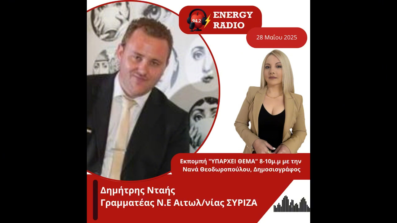 Ο Γραμματέας του ΣΥΡΙΖΑ Αιτωλ/νίας Δημήτρης Νταής σε συνέντευξή του στην δημοσιογράφο Νανά Θεοδωροπούλου, στην εκπομπή «ΥΠΑΡΧΕΙ ΘΕΜΑ» στον Energy 94.2 αναφέρθηκε στο συνέδριο που θα πραγματοποιηθεί 12-15 Ιουνίου στο Δημοτικό Γυμναστήριο Μπάσκετ Περιστερίου, στην διαδικασία που είναι σε εξέλιξη για την κατάθεση υποψηφιοτήτων καθώς και στις γενικότερες διεργασίες στην κεντροαριστερά όπως και στις πληροφορίες που φουντώνουν περί πιθανής επιστροφής του Αλέξη Τσίπρα.