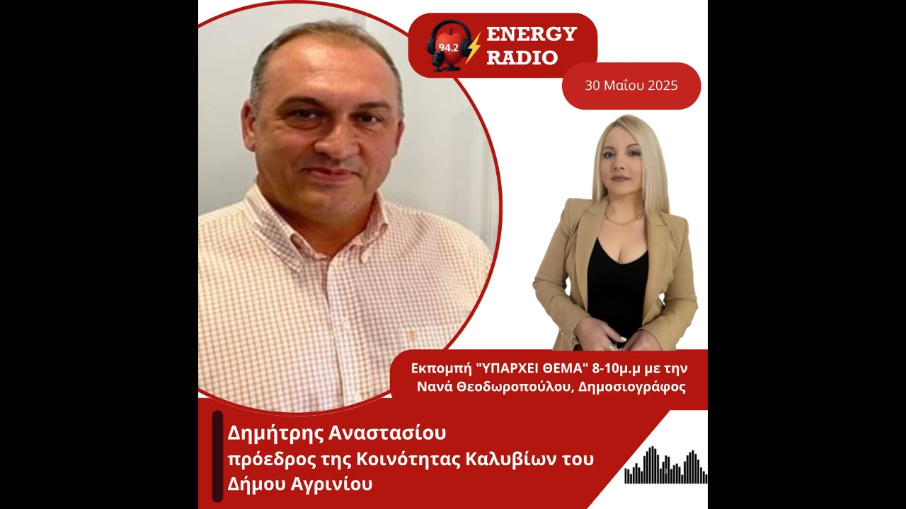 Ο Δημήτρης Αναστασίου, πρόεδρος της Κοινότητας Καλυβίων του Δήμου Αγρινίου σε συνέντευξή του στην δημοσιογράφο Νανά Θεοδωροπούλου, στην εκπομπή «ΥΠΑΡΧΕΙ ΘΕΜΑ» στον Energy 94.2 αναφέρθηκε αναλυτικά στις ζημιές που έχουν υποστεί οι καλλιέργειες από την πρόσφατη χαλαζόπτωση σημειώνοντας ότι ξεκίνησαν οι δηλώσεις των παραγωγών στον ανταποκριτή του ΕΛΓΑ. Επίσης ο κ.Αναστασιου αναφέρθηκε σε μια σειρά έργων που είναι σε εξέλιξη στην περιοχή, όπως αγροτική οδοποιία, ασφαλτοστρώσεις, ηλεκτροφωτισμός κ.τ.λ