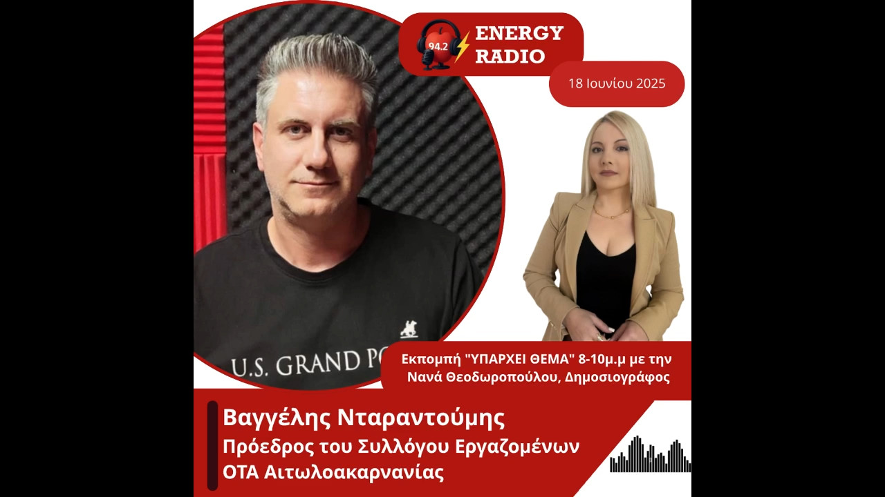 Συνέντευξη στον ραδιοφωνικό σταθμό Energy 94.2 και στην εκπομπή «ΥΠΑΡΧΕΙ ΘΕΜΑ» με την δημοσιογράφο Νανά Θεοδωροπούλου παραχώρησε o πρόεδρος του Συλλόγου Εργαζομένων ΟΤΑ Αιτωλοακαρνανίας Βαγγέλης Νταραντούμης σχετικά με τις γενικές συνελεύσεις που πραγματοποιήθηκαν σε όλους τους Δήμους με κύρια αιτήματα τη μόνιμη και σταθερή δουλειά για τους εργαζομένους, τις προσλήψεις προσωπικού, τον τερματισμό των ιδιωτικοποιήσεων δημοτικών υπηρεσιών.