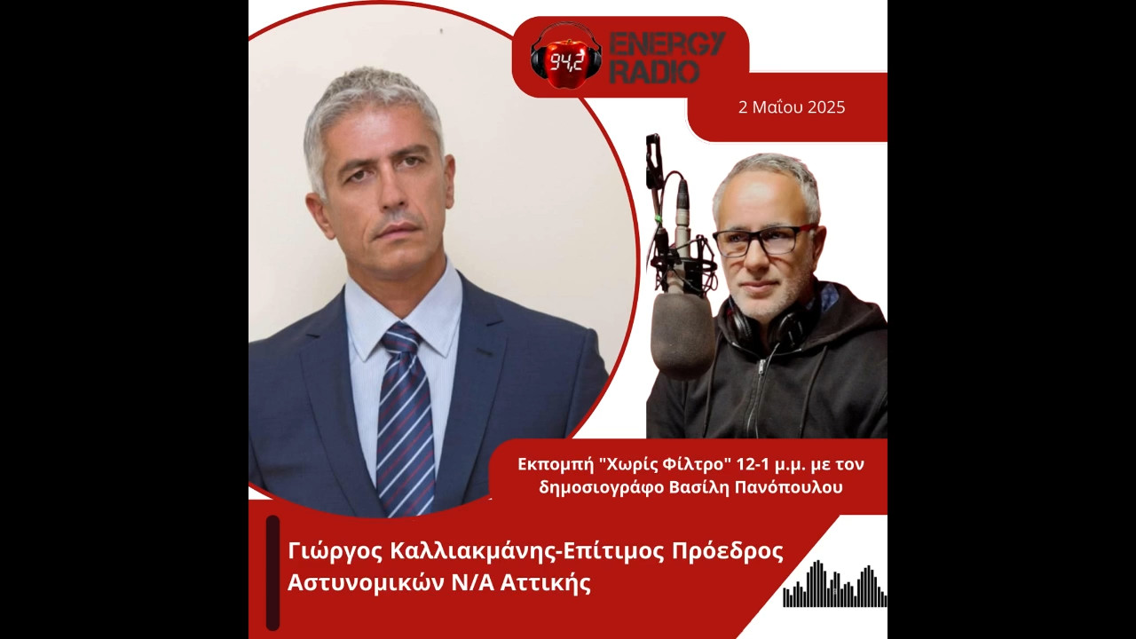 Αποκλειστική συνέντευξη στον ραδιοφωνικό σταθμό Energy 94.2 και στην εκπομπή «ΧΩΡΙΣ ΦΙΛΤΡΟ» του δημοσιογράφου Βασίλη Πανόπουλου παραχώρησε ο Γιώργος Καλλιακμάνης, επίτιμος Πρόεδρος Αστυνομικών Υπαλλήλων Νοτιοανατολικής Αττικής και αναπληρωτής γραμματέας του ΠΑΣΟΚ- ΚΙΝΑΛ στον τομέα Προστασίας του Πολίτη. Να σημειωθεί ότι ο Γιώργος Καλλιακμάνης έλκει την καταγωγή του από την Αιτωλοακαρνανία και συγκεκριμένα το Αγρίνιο. Μίλησε για τις βασικές αιτίες που οδήγησαν στην αύξηση της εγκληματικότητας καθώς και για τον ρόλο της αστυνομίας στην αντιμετώπιση αυτής της εγκληματικότητας. Επίσης έδωσε ιδιαίτερη έμφαση στο γεγονός ότι το τελευταίο διάστημα παρατηρήθηκε αύξηση της εγκληματικότητας τόσο αριθμητικά όσο και ποιοτικά.