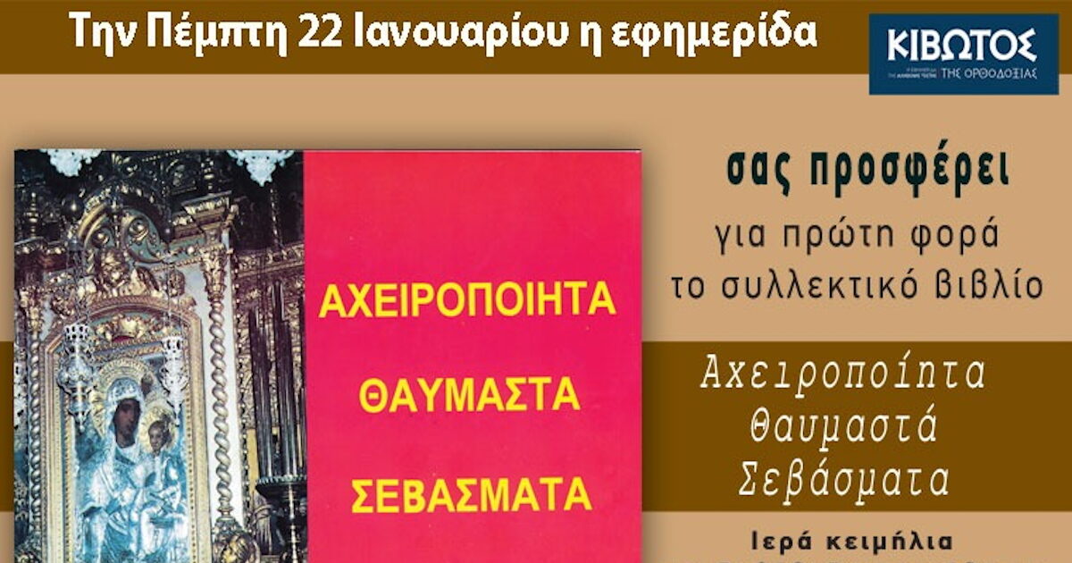 Κυκλοφορεί την Πέμπτη 22 Ιανουαρίου 2026 το νέο φύλλο της Εφημερίδας «Κιβωτός της Ορθοδοξίας» και σας προσφέρει για πρώτη φορά το συλλεκτικό βιβλίο «Αχειροποίητα Θαυμαστά Σεβάσματα».